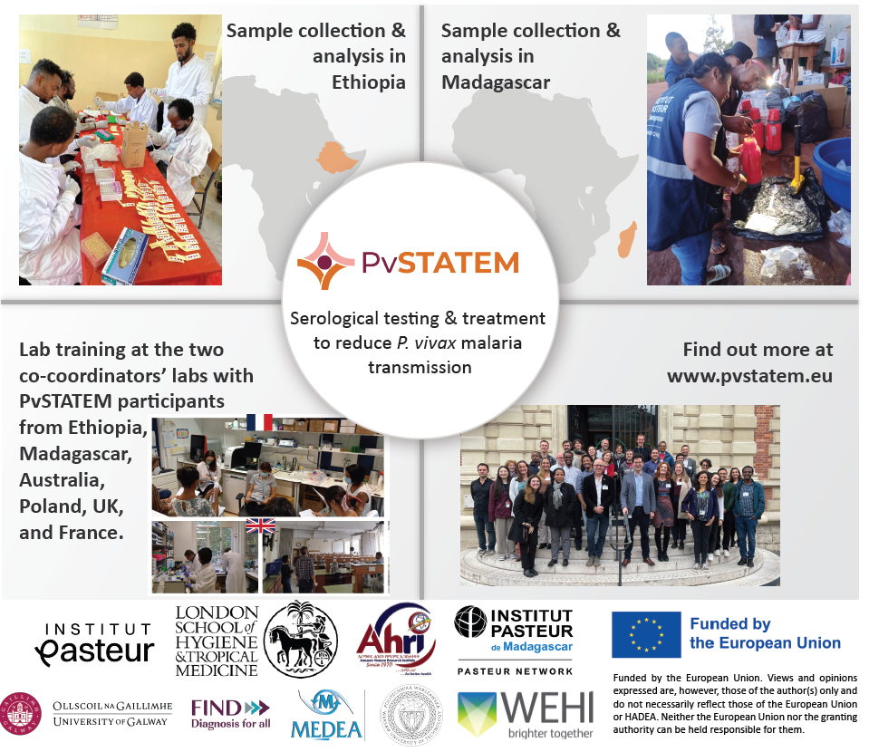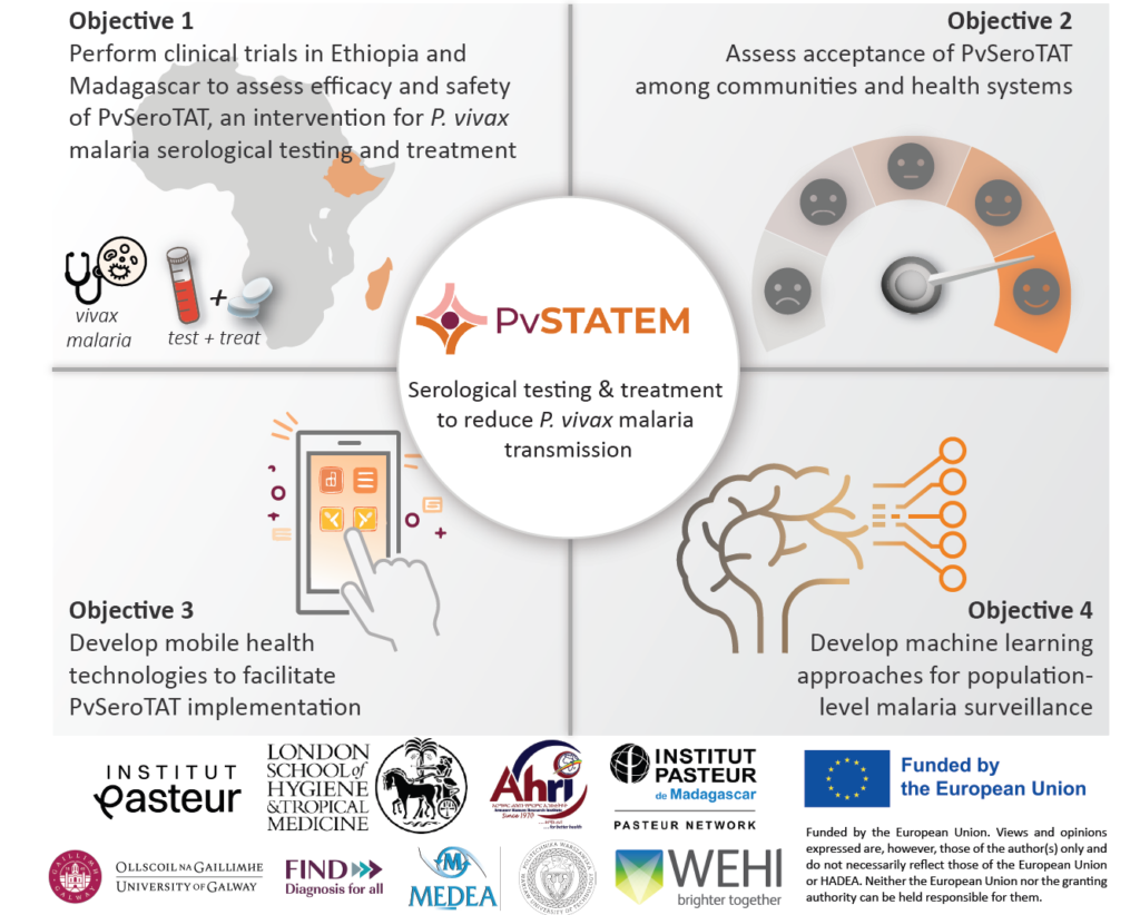 Malaria eradication requires addressing all malaria species, including Plasmodium vivax that resists elimination efforts because of its dormant liver forms (“hypnozoites”). These forms cannot be detected with traditional methods, but they can reactivate (“relapse infection”) causing illness and new transmission from people to mosquitoes. The P. vivax Serological Testing and Treatment in Ethiopia and Madagascar (PvSTATEM) project aims to address this challenge. We have developed a diagnostic test to identify people likely to carry hypnozoites and target them for treatment to clear hypnozoites and prevent relapse infection. This combination of a novel diagnostic test and primaquine treatment provides a new intervention for malaria control and elimination. In PvSTATEM we plan to assess the efficacy, safety, and acceptability of this new intervention of serological testing & treatment (objectives 1 & 2), as well as to develop digital approaches for better implementation (objective 3) and machine learning tools for malaria surveillance at the level of entire populations (objective 4). This Horizon Europe-funded project started in late 2022, under the coordination of Institut Pasteur and the London School of Hygiene and Tropical Medicine, with clinical trials in Ethiopia and Madagascar and key partners in 9 countries worldwide. The project is built on equal partnership and shared capacity to address a substantial public health burden.